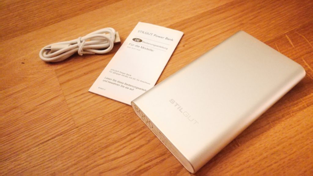 Werfen wir doch zuerst einen Blick auf den Lieferumfang. Typisch für StilGut kommt die Powerbank in einer funktionellen und edlen Verpackung daher. Darin befindet sich neben der Powerbank, ein microUSB-Kabel und eine deutsche Kurzanleitung. Ein paar Worte noch zur Kurzanleitung: Lasst euch nicht verwirren, da dort die Rede von einer Taschenlampe ist. Die LED-Taschenlampe gibt es in der UltraSlim-Reihe nicht. Ansonsten dürfte wohl jedem von euch klar sein, wie eine Powerbank funktioniert. 🙂