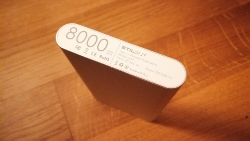 StilGut gibt das Gewicht der 8000 mAh Powerbank mit 242 Gramm an bei Massen von 120 x 70 x 16 mm. Das Gewicht und die Masse gehen aufgrund der Akkugrösse vollends in Ordnung.