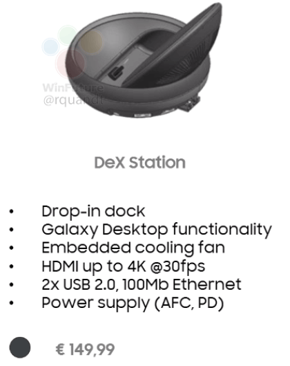 Die DeX-Docking-Station kennen wir bereits aus einer Zeichnung in einer Bedienungsanleitung von Samsung. Diesmal sehen wir aber ein „echtes“ Bild der Docking-Station und erhalten auch ein paar interessante Infos dazu. So wird das Dock den Qi-Standard unterstützen und kann das Galaxy S8 somit auch kabellos aufladen. Das Dock wird über den USB Typ C-Anschluss an einen beliebigen Monitor angeschlossen, woher auch der Strom stammt. Im Dock ist zudem ein aktiver Lüfter untergebracht, der das Galaxy S8 etwas abkühlt. Glaubt man den Gerüchten, so wird Samsung die Funktion als „Samsung Galaxy Desktop“ vorstellen.