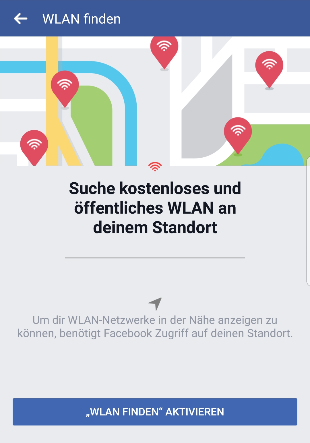 Ab sofort kann direkt über die Android-App von Facebook nach verfügbaren WLAN-Hotspots gesucht werden. Wird die Funktion „WLAN finden“ in der Facebook-App aktiviert, werden automatisch die in der Nähe verfügbaren WLAN-Hotspots angezeigt. In der App werden allerdings nur die Hotspots angezeigt, welche von den Anbietern auch bei Facebook hinterlegt wurden.