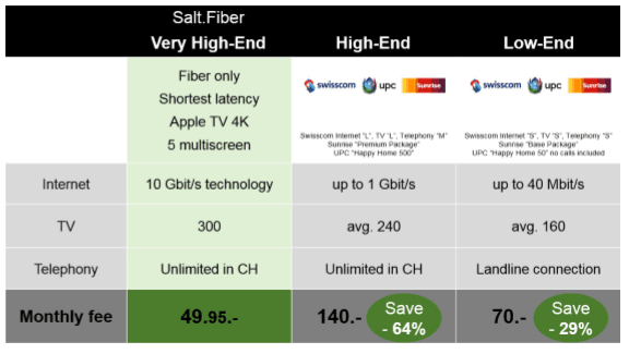 Dank einer einzigen und unkomplizierten Produktformel ist Salt Fiber nicht nur das technologisch fortschrittlichste Triple-Play Angebot der Schweiz sondern auch das transparenteste und einfach verständlichste Vollsortiment an Telekommunikationsdiensten, welches Festnetztelefonie, TV und Breitbandinternetdienste umfasst.