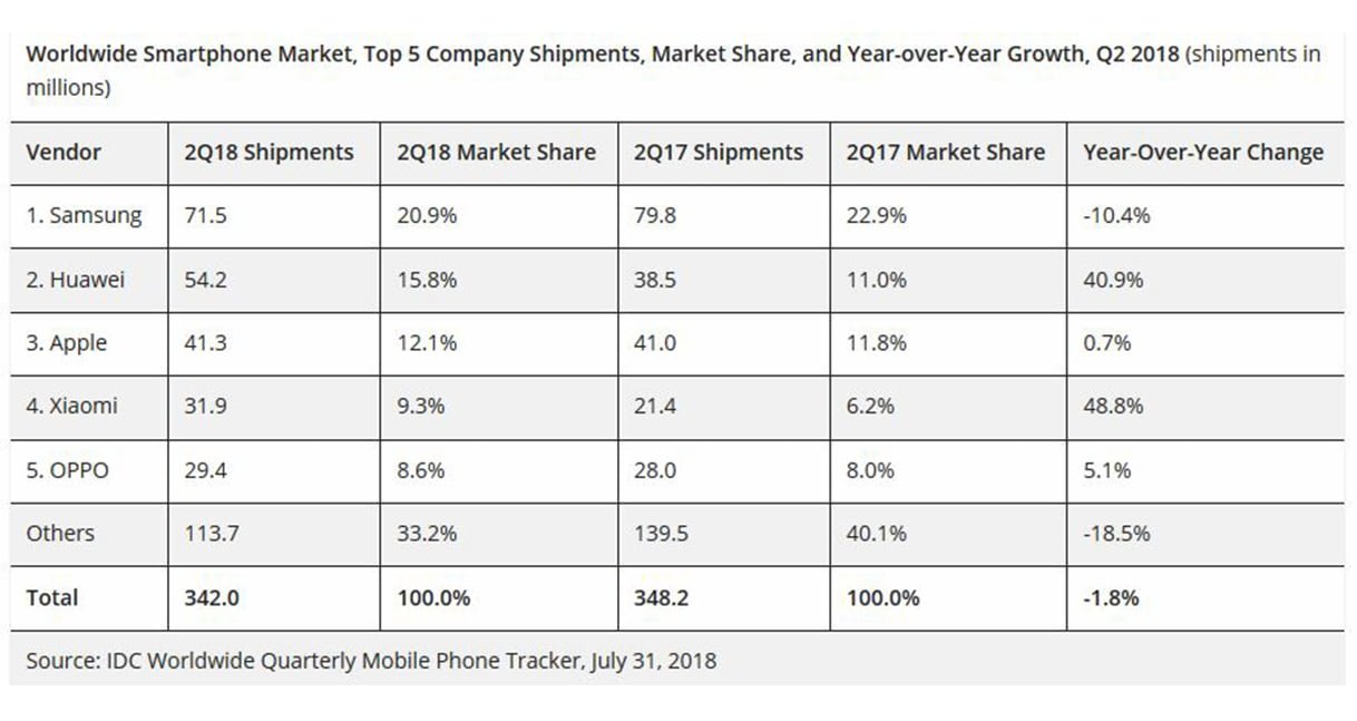Die chinesischen Hersteller sind auf dem Vormarsch wie die neuen IDC-Zahlen zeigen. Im zweiten Quartal konnte sich Huawei mit weltweit 54 Millionen verkaufter Smartphones den zweiten Platz sichern. Damit überholt der chinesische Hersteller Apple, die immerhin auf 41 Millionen verkaufte iPhones kommen.