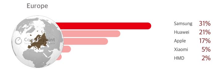 Mit einem Marktanteil von 31 Prozent liegt Samsung auch im zweiten Quartal 2018 an der Spitze in Europa und wohl auch weltweit. Auf dem zweiten Platz folgt wie erwartet Huawei mit 21 Prozent, dicht gefolgt von Apple mit 17 Prozent. Auch erwähnenswert ist Xiaomi, die inzwischen auf einen Marktanteil von 5 Prozent kommen – was durchaus als Achtungserfolg angesehen werden kann. Auf dem fünften Platz folgt dann, wie bereits erwähnt, HMD Global mit 2 Prozent.