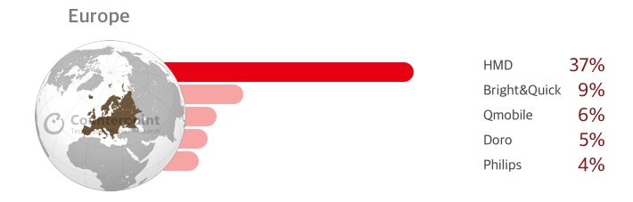 Mit dem Nokia 3310 oder Nokia 8110 gibt es zudem zwei interessante Feature-Phones, die sich offensichtlich auch richtig gut verkaufen. Bei den Feature-Phones konnte sich die Nokia-Lizenznehmerin mit einem Marktanteil von 37 Prozent sogar die Spitzenposition in Europa sichern. Abgeschlagen auf den weiteren Rängen folgen eher unbekanntere Hersteller, bis auf Doro und Philips.