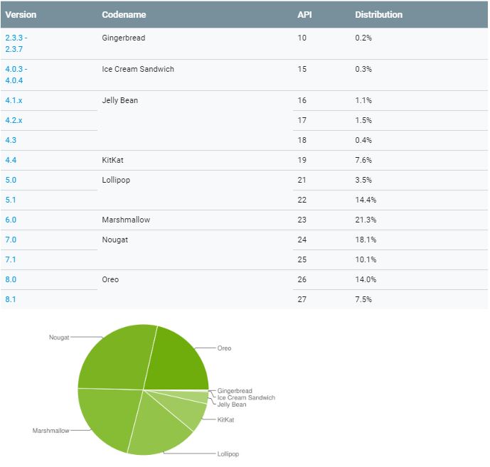 Google hat auch für Oktober die neuen Zahlen zur Android-Verteilung veröffentlicht. Im Vergleich zu den Zahlen vom September hat sich allerdings nicht wahnsinnig viel getan. Android 9 Pie ist auch weiterhin nicht in der Auflistung von Google zu finden. Ich behaupte mal das so lange Samsung keines der eigenen Flaggschiff-Smartphones mit Android 9 Pie aktualisiert, der Anteil auch vernichtend klein bleiben wird.