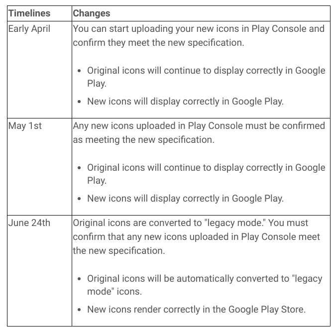 Das neue Design für App-Icons wird auf der obigen Grafik in der Mitte dargestellt. Ab dem 1. Mai 2019 können Entwickler nur noch Icons in diesem Design mit abgerundeten Ecken hochladen – alles andere ist nicht mehr erlaubt. Das runde App-Icon wird so nicht mehr erlaubt sein. Bei allen Apps die kein angepasstes Icon erhalten, werden ab dem 24. Juni ein sogenanntes „Legacy Mode“ Icon erhalten – also mit weißem Hintergrund.