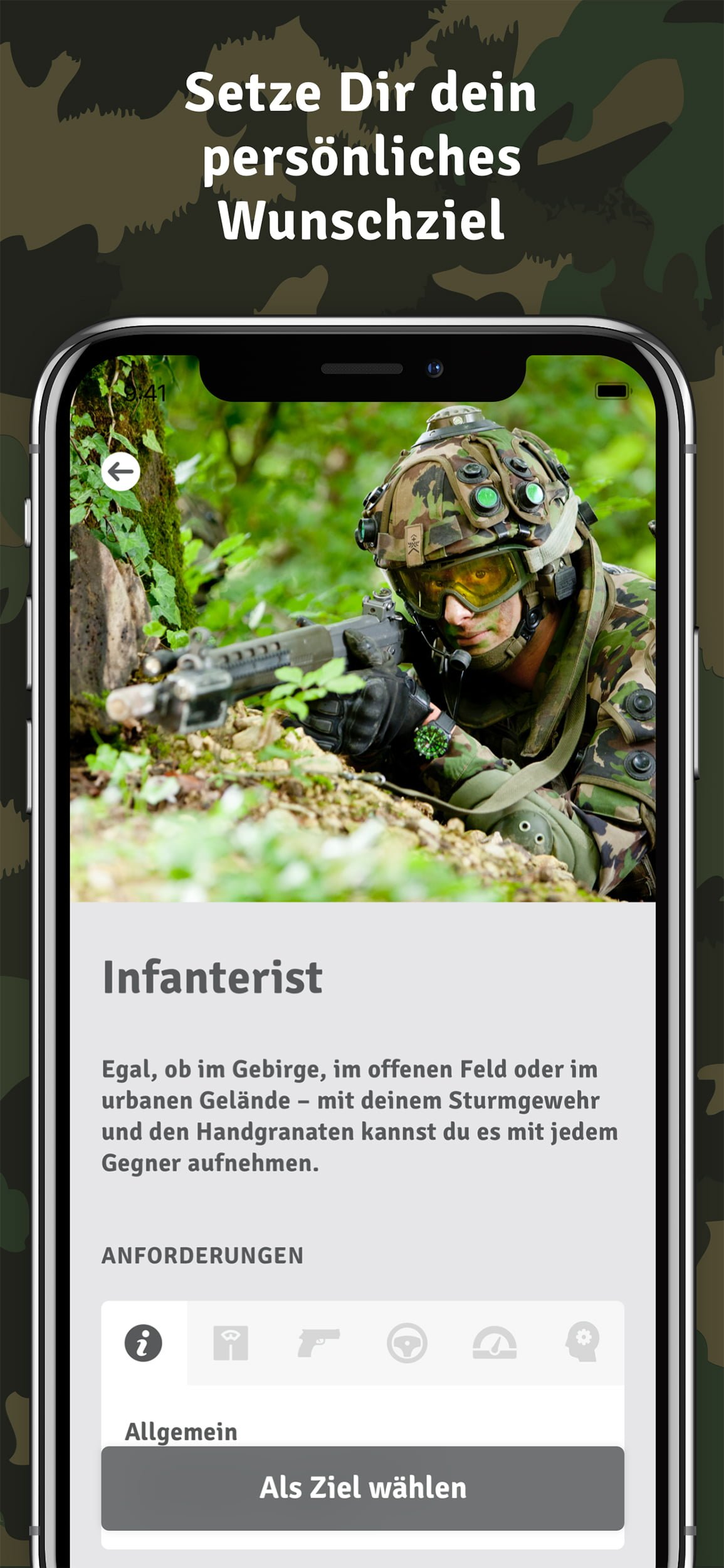 Die App wurde in erster Linie für Jugendliche entwickelt, die sich auf die Aushebung bzw. Rekrutierung und den Alltag in der Rekrutenschule vorbereiten möchten. Je nach angestrebter Funktion, kann die App ein darauf abgestimmtes Sportprogramm erstellen. Damit sollen junge Männer und Frauen denjenigen Fitnesslevel erreichen, den sie benötigen, um für die gewünschte Funktion infrage zu kommen.