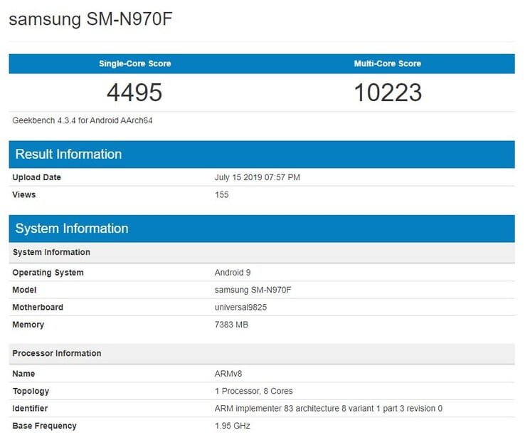 Bei Geekbench ist zumindest jetzt ein Galaxy Note 10 (SM-N970F) mit 8 GB Arbeitsspeicher und dem oben gennanten Samsung-Chipsatz aufgetaucht. Die erreichten Werte reissen mich jetzt aber nicht wirklich vom Hocker. Sie sind ungefähr auf dem gleichen Niveau, wie die vom Galaxy S10 mit Exynos 9820-SoC. Allerdings könnte es sich dabei um ein Vorseriengerät handeln, welches bis zum Marktstart noch optimiert wird.