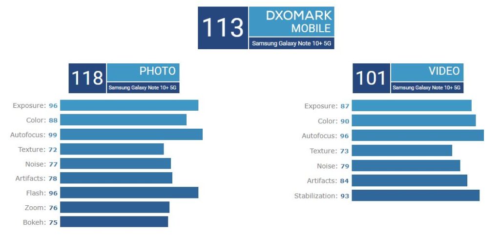 Das Galaxy Note 10+ erreicht insgesamt 113 Punkte (Foto + Video kombiniert), das P30 Pro kommt auf einen Punkt weniger. In der Disziplin Foto bleibt das P30 Pro mit 119 Punkte vor Samsung’s neuem Flaggschiff-Smartphone, welches auf 118 Punkte kommt. Dafür übertrumpft das Galaxy Note 10+ das P30 Pro in puncto Video klar und deutlich mit 101 gegenüber 97 Punkten.