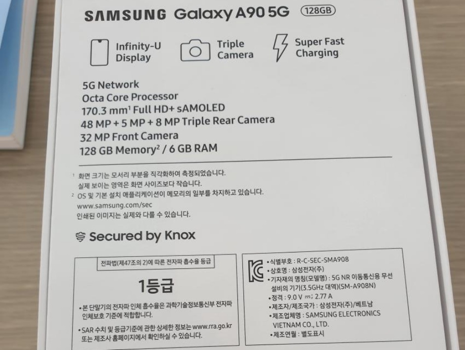 Des Weiteren gibt es auf der Rückseite eine Triple-Kamera mit 48 + 5 + 8 MP und eine Frontkamera mit 32 MP. Ebenfalls bestätigt uns die Verpackung, dass sich der Akku dank „Super Fast Charging“ offensichtlich sehr schnell aufladen lässt. Ob hier die 45W vom Galaxy Note 10+ geboten werden, ist nicht bekannt. Erwartet wird übrigens ein Akku mit ca. 4500 mAh Kapazität.