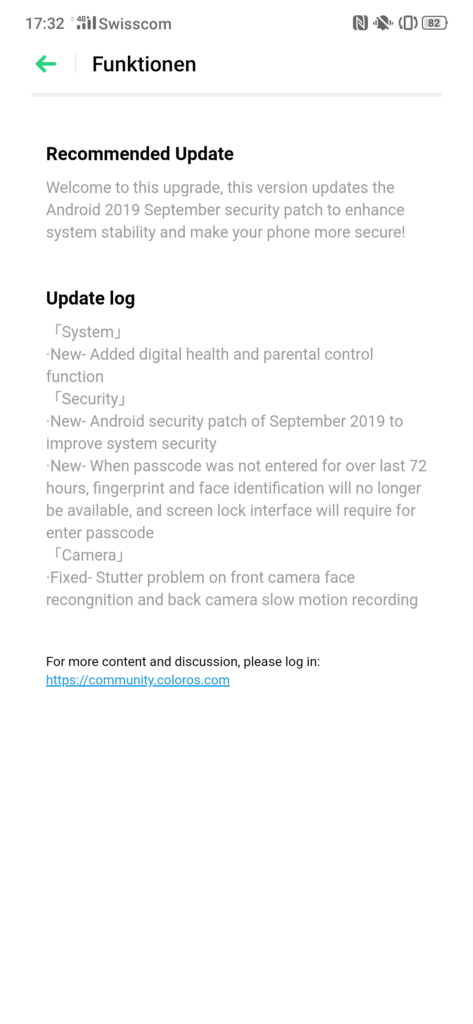 Was mich aber erstaunt hat, war der inzwischen etwas angestaubte Android-Sicherheitspatch. Dieser Umstand wird mittels neuem Update korrigiert. Oppo verteilt in der Schweiz ein neues OTA-Update, mit dem der Android-Sicherheitspatch vom September 2019 auf das Smartphone gelangt. Damit ist der Sicherheitspatch zwar weiterhin nicht ganz aktuell, aber immerhin aktueller als zuvor.