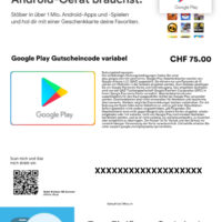 Auch Google Play Guthaben ist erhältlich. Die Gutscheine sind als wählbarer Betrag zwischen CHF 10 und 300 erhältlich.
