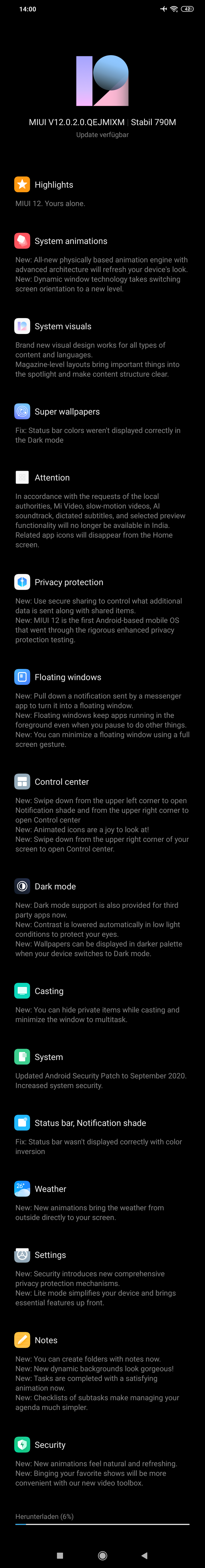Das Xiaomi Pocophone F1 wird ab sofort in Europa bzw. der Schweiz mit einem neuen Software-Update auf MIUI 12 basierend auf Android 10 versorgt. Das OTA-Update ist heute auf meinem Gerät zum Download angeboten worden, trägt die Bezeichnung V12.0.2.0.QEJMIXM und bringt es auf eine Download-Grösse von ca. 790 Megabyte.